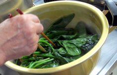 ホウレン草を茹で、水にさらした後、おか上げして水気を切る |