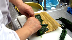 巻きすに、茎を切った葉を縦に平らに並べ |