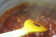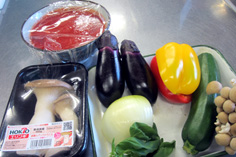 タマネギ 1/4個 ナス 2本 ズッキーニ 1本 赤・黄パプリカ 各1/2個 エリンギ茸 2本 シメジ 1/2パック ホールトマト(漉して) 500g バジル 1枝 |