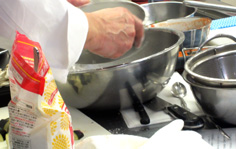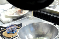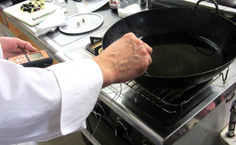 | 焦がさないように注意しながらフライパンを傾けて勢いよくかける | |
