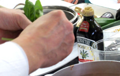 バジルを手でちぎって加える |