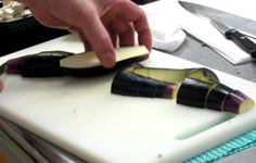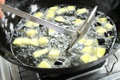 ナスは揚げると小さくなるので、やや大きめに切る |