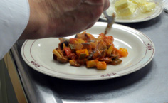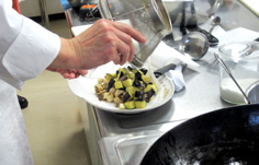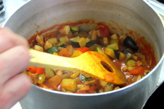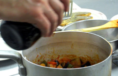 カポナータの鍋にオリーブオイルを少しまわし掛け |