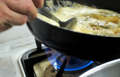 フライパンを傾けてバターを溶かし、泡立ってきたらスプーンで掛けまわす |