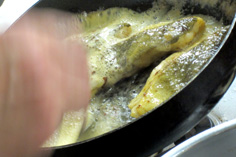 皮目に色が付き、半分ほど火が入ったら返す。身側に水分が浮いてきて、しっとりしてくる |