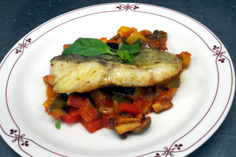 上に真鱈のムニエルをのせ、バジルを飾って完成! |
