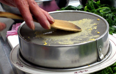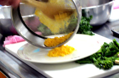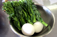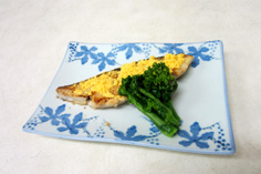 鰆はフライパンでフタをして、両面焼く。表面に卵そぼろをのせ、菜の花を添える