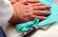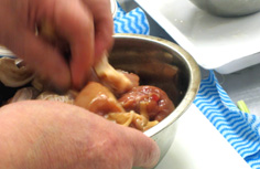 ねかせた鶏モモ肉に片栗粉をふり入れ、混ぜる |