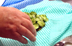 キュウリは薄く輪切りにし、塩少々をふる。しばらく置いてしんなりしたら味をみて、塩辛いときは水でさっと洗う |