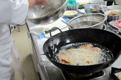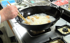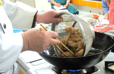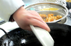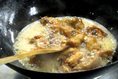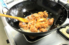 もう一度鶏モモ肉をもどし、全体に火を通す。二度揚げすると、カラッと揚る |
