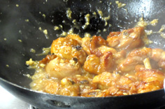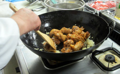 鶏モモ肉をザルに取り、中華鍋の油をあけ、大さじ2の油で薬味を入れて炒める |