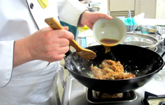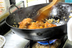 最後は鍋を振り、汁気を飛ばす。ゴマ油で仕上げる |