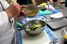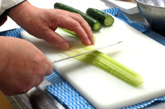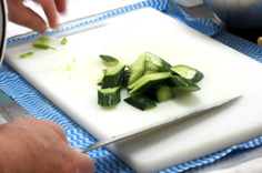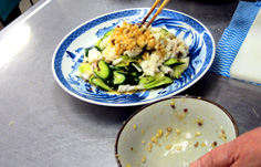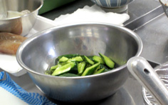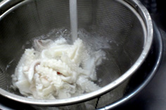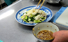 イカの水気を取り、セロリ、キュウリと一緒にボールに入れる。合わせ調味料の半分を入れ |