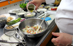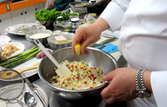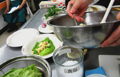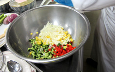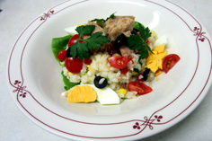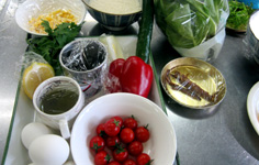 材料 4人分 生米 150g コーン缶 80g キュウリ 80g タマネギ 40g 赤パプリカ 1/4個 ニンニク 1片 レモン 1/2個 EVオリーブオイル 60cc ※飾り用 ミニトマト 8個 黒オリーブ(種抜き) 8粒 茹で卵 2個 アンチョビ 適量 ツナ缶(フレークではないもの) 小1缶 サラダ菜・イタリアンパセリ |