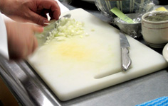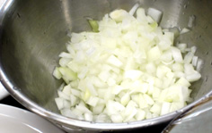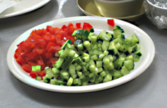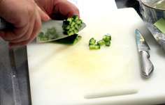 キュウリは縦に4等分、種を取って、4ミリの角切り |