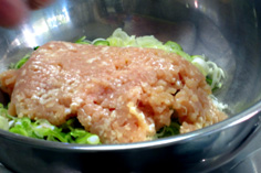 ネギと挽肉をボールに入れ |