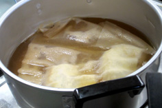 八方汁を煮立てて小揚げを入れ、キッチンペーパー等をかぶせ、10分くらい煮含める |