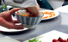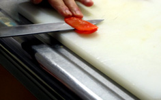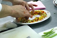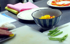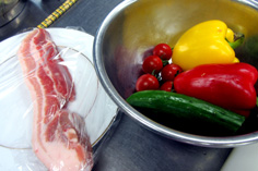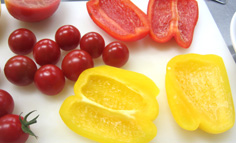 パプリカは種を取り、中の白いところを除く。プチトマトはへたを取る(きずを付けると、後で水気が出るので注意) |