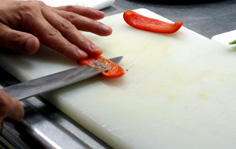 パプリカを縦半分に切り、内側を薄く切り取る |