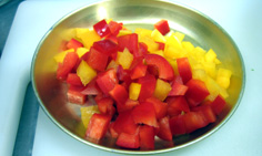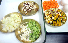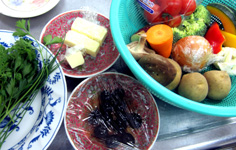 材料 4人分 鶏ムネ肉 160〜200g ジャガイモ 100〜130g サツマイモ 40g タマネギ 40g ニンジン 20g カボチャ 40g 生シイタケ 20g カリフラワー 40g ブロッコリー 40g パプリカ(赤・黄) 各20g ミニトマト 8個 黒オリーブ(種抜き)の塩漬け(輪切り) 8粒 |