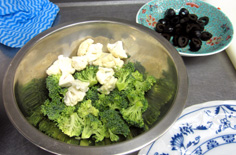 カリフラワーとブロッコリーは小房に切り、茎は小さい角切り。黒オリーブは輪切り(塩気を確認) |