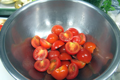 ミニトマトは半分にし、オリーブオイルと塩、コショウを軽くふっておく。盛り付けに飾る |