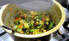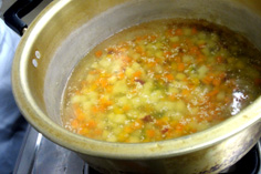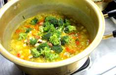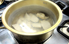 取り出して冷ます。スープは捨てない。この後、野菜を茹でる |