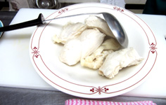 鍋に水を張り、皮をむいた鶏ムネ肉を2cmほどの厚さに切り茹でる |