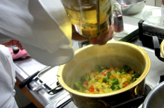 鶏肉をゆでたスープに硬い野菜から入れて茹でて行く |