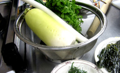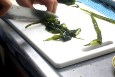 生ワカメはさっと茹で、水にとり、茎をはずして食べ易く切る |