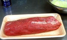 常温に戻した肉に、塩(肉の1%)・コショーをし、15分おく。お湯を沸かしておく |