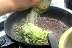フライパンを洗い、Aのタレを入れ(きび砂糖を除く)、沸いたらネギと大葉を加え |