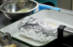 ここで更にアルミホイルで包み、粗熱が取れるまで肉を休ませる |