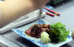 付け合せのワサビ菜、ワカメ、大根おろしを盛り、タレをかける |