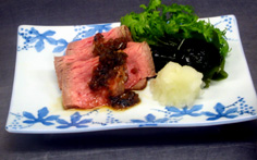 材料 4人分 牛肉(肩ロース芯) 500g 長ネギ 1本 大葉 10枚 A 酒 大さじ5 醤油 大さじ3 水 大さじ2 きび砂糖(後で入れる) 大さじ1 ※付け合せ 大根おろし 適宜 生わかめ 150g ワサビ菜(他の葉物でも) 適宜 |