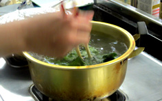 塩を入れたお湯で、さっと茹でる。しゃぶしゃぶする感じ。水に取らない! |