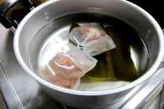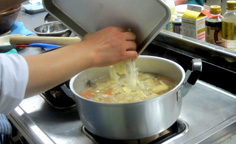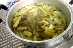 鍋に昆布10cmと鰹節20gを入れ、ゆっくり煮出す。粕汁のような場合は、昆布も鰹節と一緒に時間をかけてだしを引き出す |