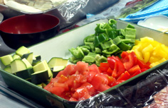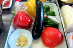 ラタトゥイユ用の食材 6人分 赤・黄パプリカ 各1個 青ピーマン 3個 ズッキーニ 1本 トマトジュース 40cc 白ワイン 30cc ローリエ 1枚 トマト 1個 ニンニク 1片 オリーブオイル 適宜 カレー粉 5g 塩・白コショー 適宜 |