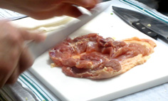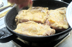 モモ肉はスジを切り、厚みが平均になるようにする |