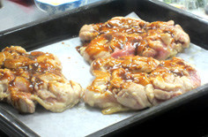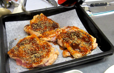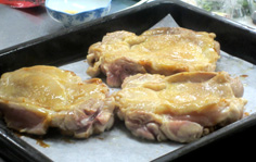 鉄板にオーブンシートを敷き、モモ肉を乗せる |