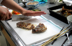 食べ易く切る。天板に残ったソースは、最後に皿に盛りつけた上からかけるので取っておく |