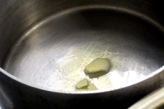 鍋にオリーブオイルと、潰したニン二クを入れて火を付け |