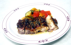 皿に鶏モモ肉を盛り、ソースをかけ、ラタトゥイユを添える。完成! |