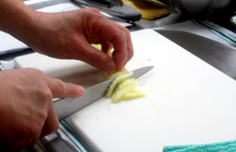 縦半分に切り、2〜3mmの斜め切り |