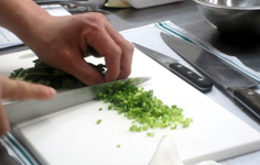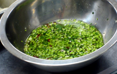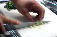 ソース用のパクチーは茎を微塵に切る。葉はサラダの方に |