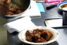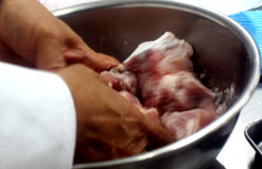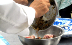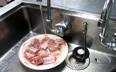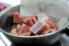 スペアリブは流水で30分流す。このようにしてから蒸すと、ホクホクした食感になる |