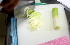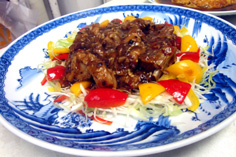 器の下に水気を取ったネギを敷き、スペアリブを山高に盛り、パプリカを飾る。完成! |
