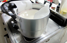 蒸し器と深みのある皿、長いフキンを用意。このようにすると、後で取り出しやすい |