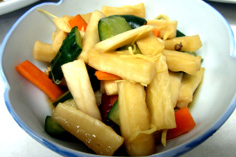 1、大根、キュウリは拍子切り、ニンジンはスライスして1時間ほど風干し 2、調味料を混ぜ、沸騰させない様に沸かす 3、冷めたらショウガ、山椒、唐辛子を入れ、野菜を加える。1日漬けて食べるが、冷蔵庫で1週間ほど持つ |