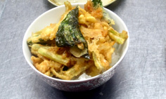 天丼タレに揚げ玉を入れ(揚げ玉を入れると味にこくが出て、おいしくなる) |